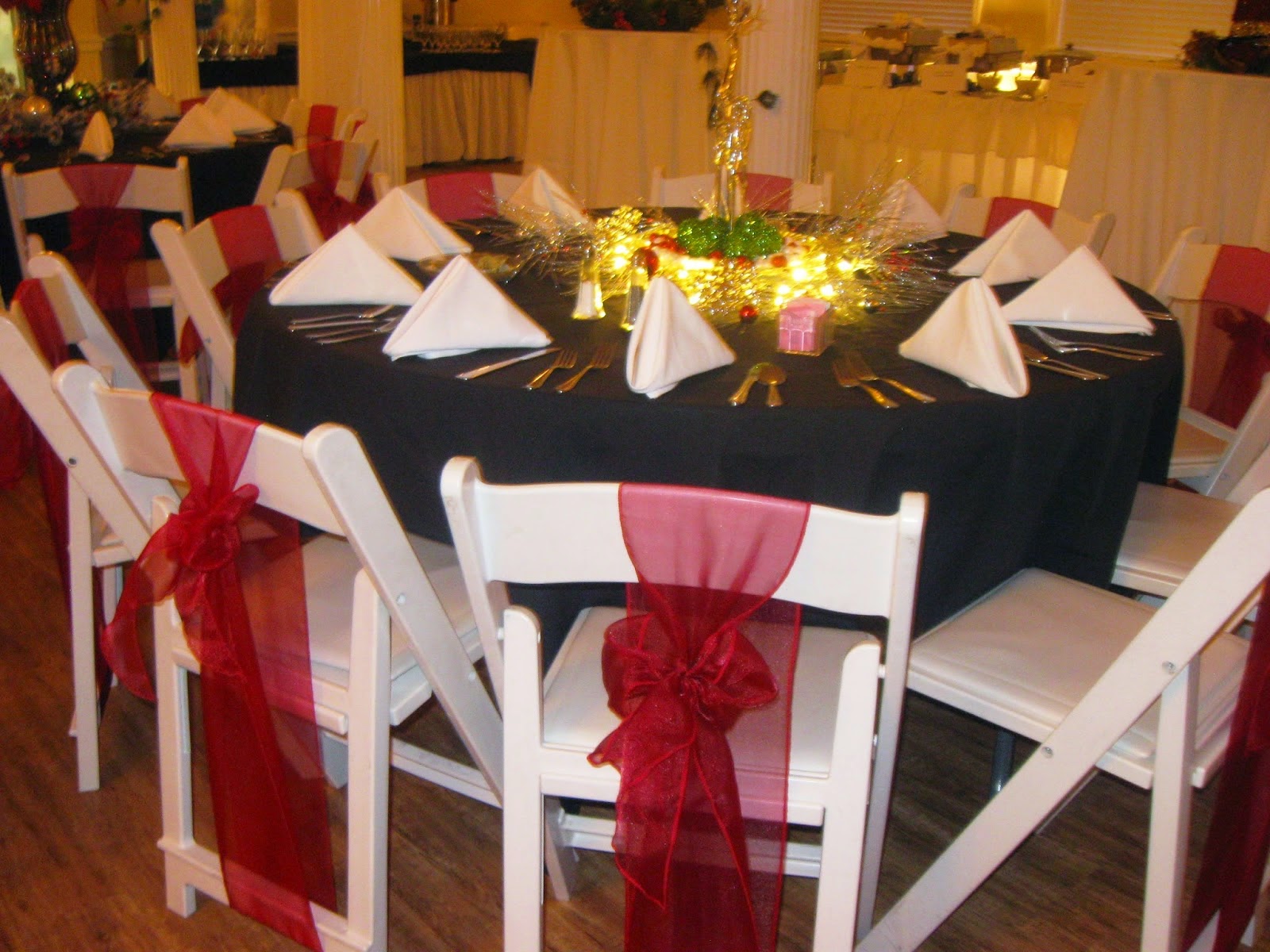 Crimson Red Organza Sashes, Black Tablecloths and White Napkins